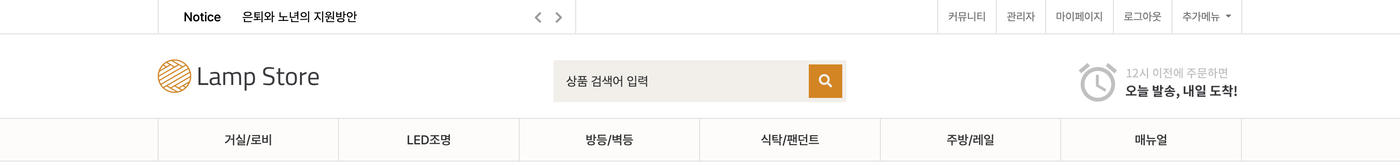 - 커뮤니티를 대신해 쇼핑몰이 메인으로 출력되게 설정되어 있으며 '관리자 - 테마설정관리 - 테마환경설정 - 메인설정'에서 설정 확인 및 변경 가능합니다.