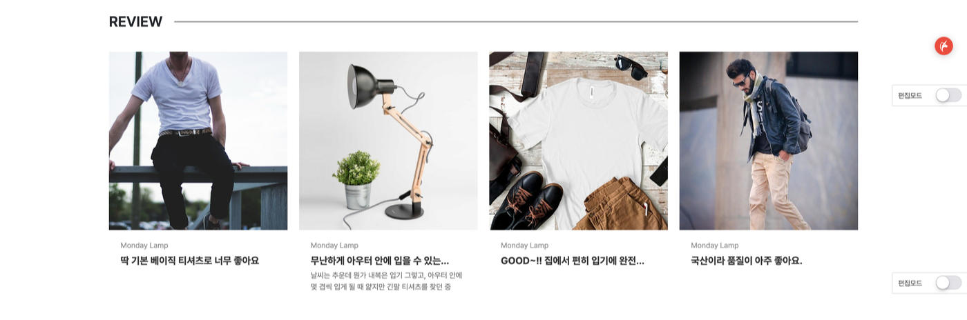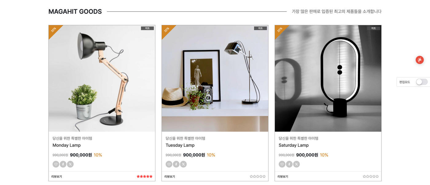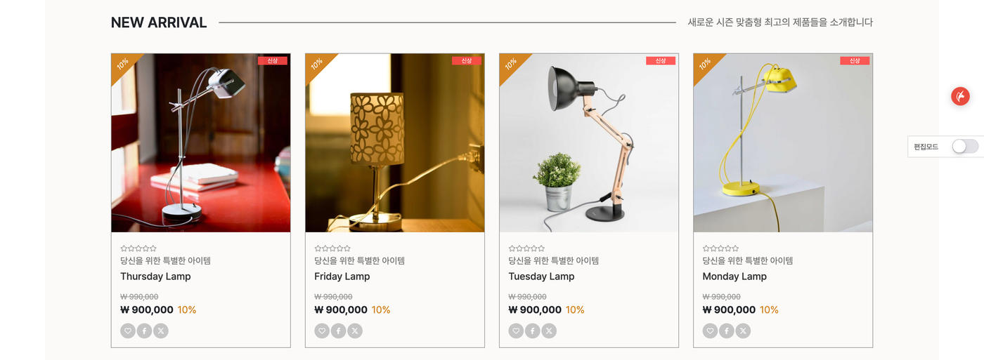 - 메인에서 편집모드를 통해 내용 및 이미지 수정이 가능하며 상품 등록 후에도 개별상품 설정이 가능합니다.