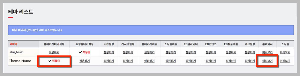 - · '관리자 - 테마설정관리 - 테마환경설정 - 메인설정'에서 쇼핑몰 메인 선택시 출력되지 않습니다.
