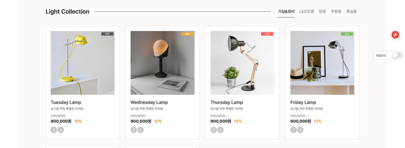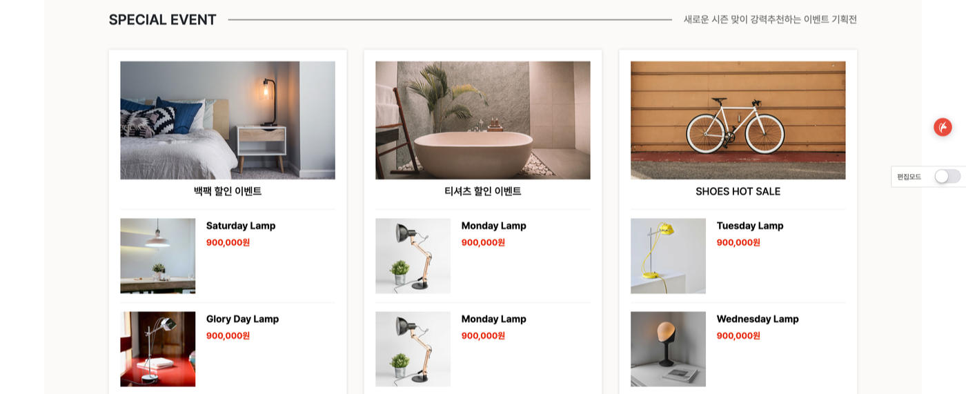 - 메인에서 편집모드를 통해 내용 및 이미지 수정이 가능하며 상품 등록 후에도 개별상품 설정이 가능합니다.