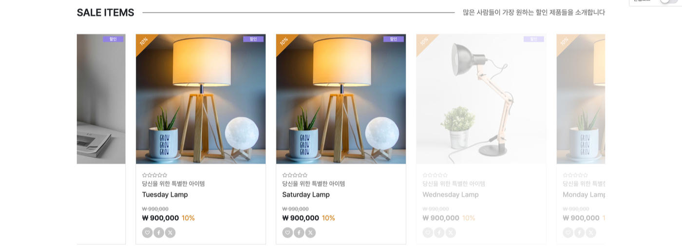 - · 할인 : 스킨(main.50.skin.php:슬라이드형) / 1줄당 이미지 수(6) / 출력할 줄 수(1) / 이미지폭(500) / 이미지높이(0)