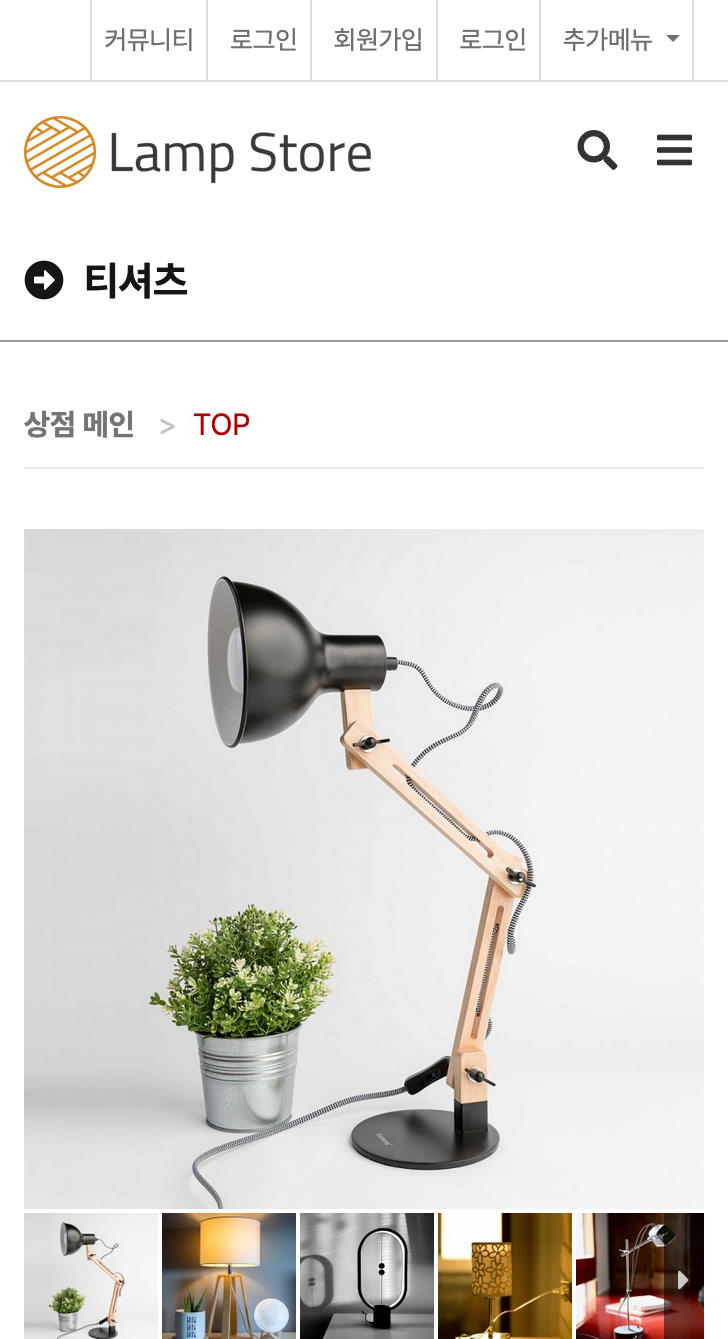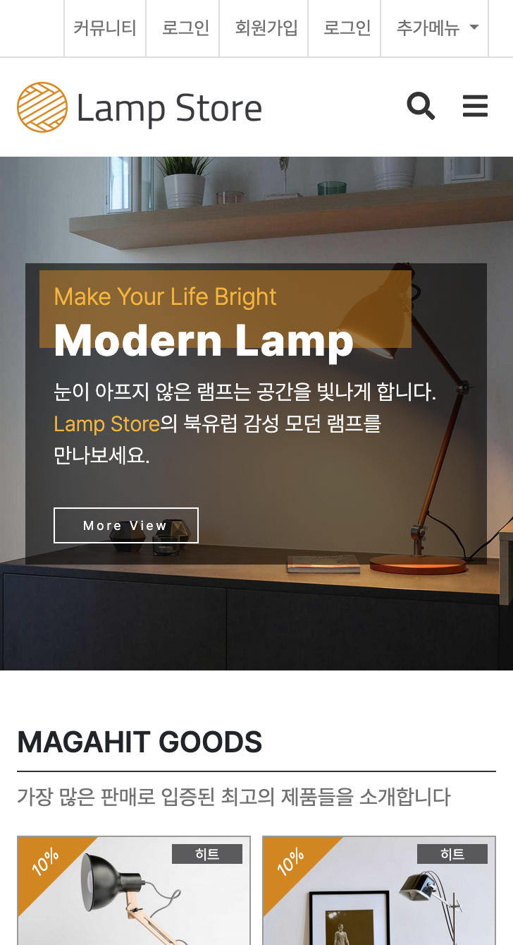 - 커뮤니티를 대신해 쇼핑몰이 메인으로 출력되게 설정되어 있으며 '관리자 - 테마설정관리 - 테마환경설정 - 메인설정'에서 설정 확인 및 변경 가능합니다.